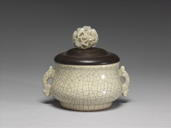 造形與故瓷017447相似,侈口,短頸,扁圓腹,內底微鼓,矮圈足,頸兩側各飾一簡化形魚耳。全器採用支、墊結合方式裝燒,內外施青釉,燒後呈米黃色,釉面灰、棕兩色紋片交錯相間,滿佈器表。圈足修飾平整,著地處塗赭汁。內底有四枚圓點狀支燒痕,外底六枚,支痕中顯露出深灰色的胎體。 魚形耳是宋元以來的瓷器和金銀器上經常可見的裝飾,對照南宋四川省窖藏的出土品以及龍泉窯青瓷雙魚耳瓶,可以見證到從較為寫實到愈發簡化的轉變。