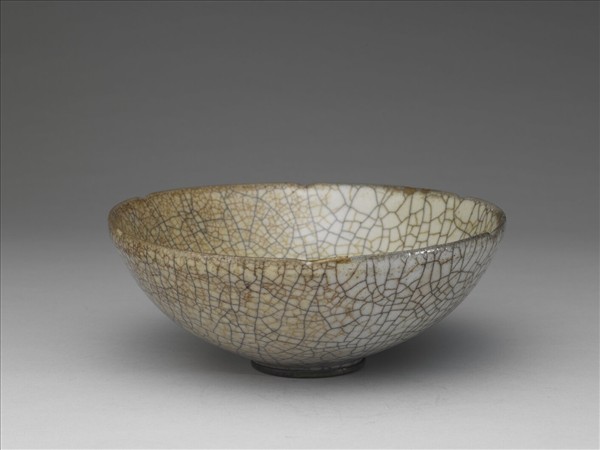 六瓣葵花口,深弧形壁,外底微凸,矮圈足。口沿有微傷損,足底外圈或因傷損而加鈐銅邊。全器施罩米黃色釉,釉色灰黃微帶月白,釉面較無光澤。內外壁米色釉面上滿佈黑灰與黃褐色細線紋,黑黃色線紋間雜形成繁密開片紋,具傳世哥窯「金絲鐵線」的作品特色。據《中國陶瓷史》所載,傳世哥窯作品,一般認為是南宋以後龍泉窯系窯場作坊,受官窯工藝影響,生產釉面帶有細碎開片紋的青瓷作品,也有一說是江西地區窯場所生產。