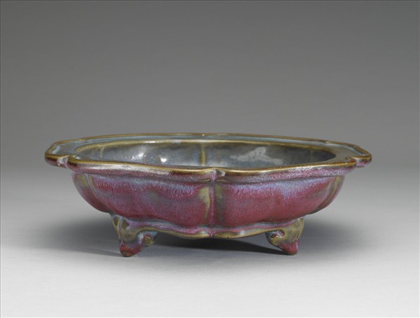 盆托,六瓣葵花形器,平口折沿,唇邊作細稜一道。淺壁,壁面依隨葵花形,作拱起、凹進的變化。平底,下承三足,足作犧首狀。厚胎濃釉,器內釉色天藍,器外壁窯變,呈現玫瑰紫色,且滿佈椶眼如橘皮。底有支釘痕跡二十枚,刻有「三」字符號。