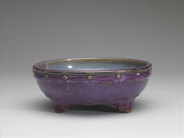 盆托,圓口微斂,淺腹,平底,三雲頭足。口沿及腹底各飾弦紋一周,其上貼飾鼓釘。器內釉色灰藍乳濁,有蚯蚓走泥紋。外壁深紫色釉,釉中帶藍點。器底刷褐色護胎釉,支釘痕十六枚,釉下刻「八」字,足底露灰白胎。鈞釉及龍泉青瓷三足鼓釘盆托在元代已常見,本件器型與龍泉大窯楓洞岩窯址出土的明代三足鼓釘洗類似,應為明早期的作品。盆托器底無孔,可隔離盆與地面的直接接觸,保護植物根部不受蟲害。托的另一功能是可蓄水保濕,因此可單獨作為盆景器使用,種植水性的植物。例如養苔石須用淺盤盛水,清黃應諶(活躍於十七世紀)畫〈陋室銘〉(中畫00155),園林中以類似的三足鼓釘花盆養石,石上綠胎點點。又,清無款〈聖壽齊天冊.萬仙祝壽〉圖(故畫03595-3),石桌上鼓釘盆內種水仙,說明鼓釘盆托具有多種使用功能。
