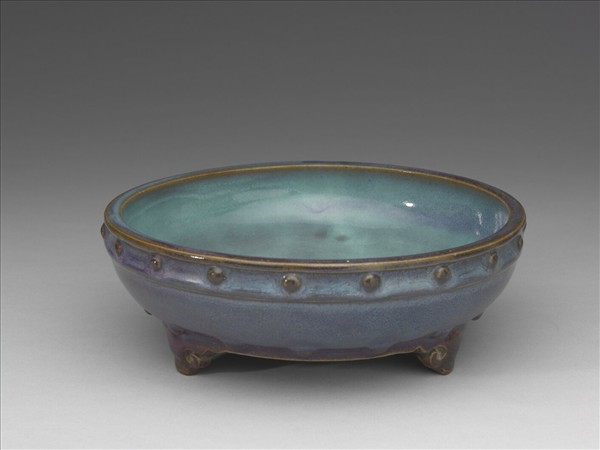 盆托,圓口微斂,淺腹,平底,三足作雲頭形。口沿、腹壁各飾弦紋一道,作乳丁貼飾,上緣十九枚,底邊十五枚。器內釉色天藍乳濁,外壁釉色變為灰紫色,面多椶眼。底有支釘痕十七枚,刻有「四」字號碼。