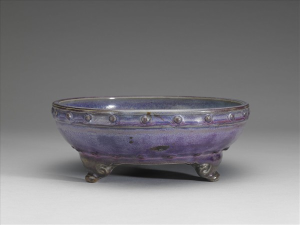 紫鈞盆托,圓口微斂,淺腹,平底,三足作雲頭形。口沿、腹壁各飾弦紋一道。腹上緣及底邊貼飾乳丁各一周。器內釉色天藍,至內壁半邊變為淺紫,外壁則全部呈現紫色。器底有蚯蚓走泥紋數道,外壁多椶眼。底有支釘痕十八枚,刻有「一」字號碼。