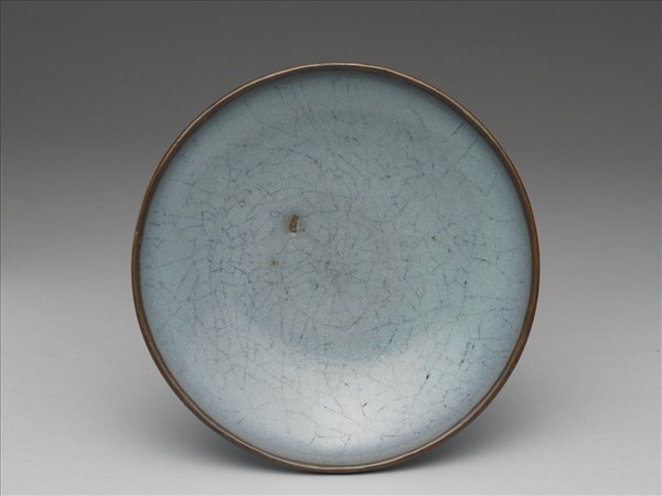 斂圓口,淺弧壁,平底,矮圈足。口沿加鑲一圈銅釦,通體罩施天藍色釉,釉色泛灰,釉表開深藍紋片,盤面及外壁皆見縮釉點,施釉至足際,足壁、底緣與內周壁無釉處,皆露褐色胎。