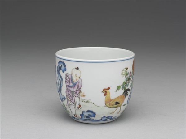 杯。斂圓口,深壁,矮圈足。除圈足外全器施白釉。器外壁釉上彩畫青綠坡石、紅、白牡丹及子母雞六隻,金黃的公雞昂首領先,多彩的母雞及鵝黃的小雞緊隨其後,小兒揚袂抬足逗公雞,一面有墨書乾隆題詩:「李唐越器人間無,趙宋官窯晨星看,殷周鼎彝世頗多,堅脆之質於焉辨,堅樸脆巧久蹔分,立德踐行義可玩,朱明去此弗甚遙,宣成雅具時猶見;寒芒秀采總稱珍,就中雞缸最為冠,牡丹麗日春風和,牝雞逐隊雄雞絢,金尾鐵距首昂藏,怒勢如聽賈昌喚,良工物態尚無遺,趋華風氣隨時變,我獨警心在齊詩,不敢耽安興以晏。」及「乾隆丙申御題」。硃紅描繪「圓」「隆」二印。器底釉下青花書「大清乾隆仿古」六篆字款。