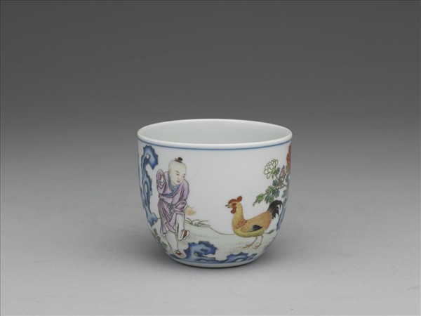 杯。斂圓口,深壁,矮圈足。除圈足外全器施白釉。器外壁釉上彩畫青綠坡石、紅、白牡丹及子母雞六隻,金黃的公雞昂首領先,多彩的母雞及鵝黃的小雞緊隨其後,小兒揚袂抬足逗公雞,一面有墨書乾隆題詩:「李唐越器人間無,趙宋官窯晨星看,殷周鼎彝世頗多,堅脆之質於焉辨,堅樸脆巧久蹔分,立德踐行義可玩,朱明去此弗甚遙,宣成雅具時猶見;寒芒秀采總稱珍,就中雞缸最為冠,牡丹麗日春風和,牝雞逐隊雄雞絢,金尾鐵距首昂藏,怒勢如聽賈昌喚,良工物態尚無遺,趋華風氣隨時變,我獨警心在齊詩,不敢耽安興以晏。」及「乾隆丙申御題」。硃紅描繪「圓」「隆」二印。器底釉下青花書「大清乾隆仿古」六篆字款。
