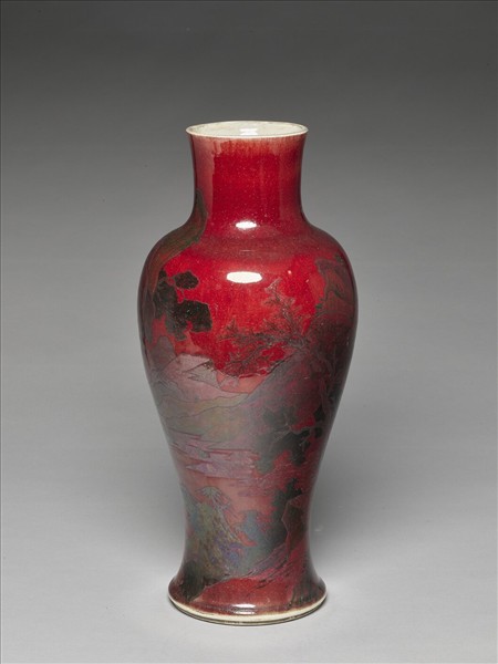 寶石紅釉墨彩山水圖梅瓶