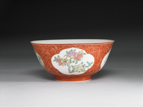 敞口,深弧壁,矮圈足。內底白釉上繪秋葵、紫菊、石竹等折枝花卉。外壁四海棠形開光內各畫牡丹、荷花、菊花、紅白梅花等四季花卉,開光之間隙地為紅地錐劃洋花卷草錦地紋。口足留白一道,胎薄透光,底藍料書「乾隆年製」四字二行仿宋體楷款,外加雙方框。