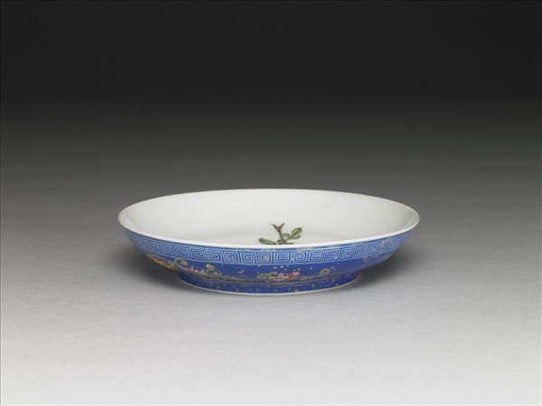 敞口,淺弧壁,平底,矮圈足。碟心白地上各以琺瑯彩繪粉紅薔薇及石竹,上墨書題句:「粉著蜂鬚膩,光凝蝶翅明」,上下朱紅鈐印「佳麗」、「翠鋪、「霞映」三印。外壁藍地上畫折枝銀蓮花、雛菊、萱花等四折枝卉,口足留白一道,口沿下則飾錐花回文一道。胎薄透光,底藍料書「乾隆年製」四字二行仿宋體楷款,外加雙方框。