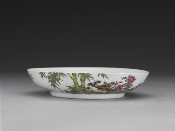 侈口碟,淺弧形壁,矮圈足。薄胎白釉。器內純白,樸素無紋飾;外壁一面彩畫綠竹、石、紅月季花,加飾靈芝、野菊,一面墨彩題句:「數枝紫豔足,長占四時春。」首尾以紅料描繪「鳳采」與「淡然」、「君子」三印。外底心書「雍正年製」雙行雙方框藍料楷書款。