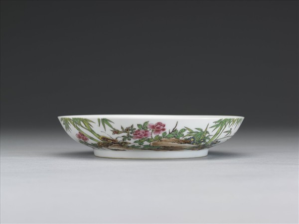 侈口碟,淺弧形壁,矮圈足。薄胎白釉。器內純白,樸素無紋飾;外壁一面彩畫綠竹、石、紅月季花,加飾靈芝、野菊,一面墨彩題句:「數枝紫豔足,長占四時春。」首尾以紅料描繪「鳳采」與「彬然」、「君子」三印。外底心書「雍正年製」雙行雙方框藍料楷書款。