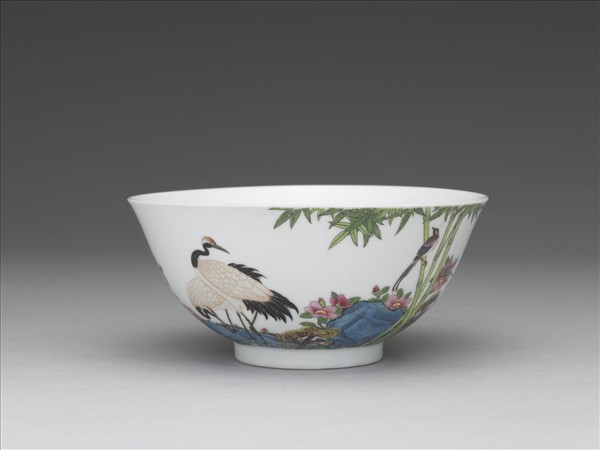 碗,侈口窄唇,深弧壁,矮圈足。薄胎骨,全器內外罩施純白釉。內壁樸素無紋飾;外壁一面彩畫綠竹、灰石、靈芝及茶花,其中加飾仙鶴、壽帶各一對。一面墨彩題句:「睡輕旋覺松花落,舞罷閒聽澗水流。」首尾各以紅料描繪「鳳采」與「彬然」、「君子」三印。圈足露胎,細白堅潤,外底心書「雍正年製」雙行雙方框藍料楷書款。