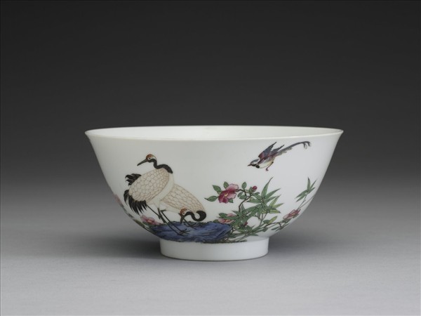 這件碗侈口、深弧壁、矮圈足。器內平素無紋,外壁彩繪藍色奇石一座,兼有竹、靈芝及茶花,並有丹頂鶴一低首一抬頭、綬帶鳥一停駐竹間一飛舞空中,此件與故瓷17543圖樣左右幾乎對稱。外壁另一面以墨書寫有「睡輕旋覺松花落,舞罷閒聽澗水流」二句,詩句出自唐朝鄭谷〈鶴〉七言律詩之頷聯。詩句前有「鳳采」,後有「彬然」(白文)、「君子」共三枚紅料印。器底帶「雍正年製」二行藍料宋體字雙方框款。