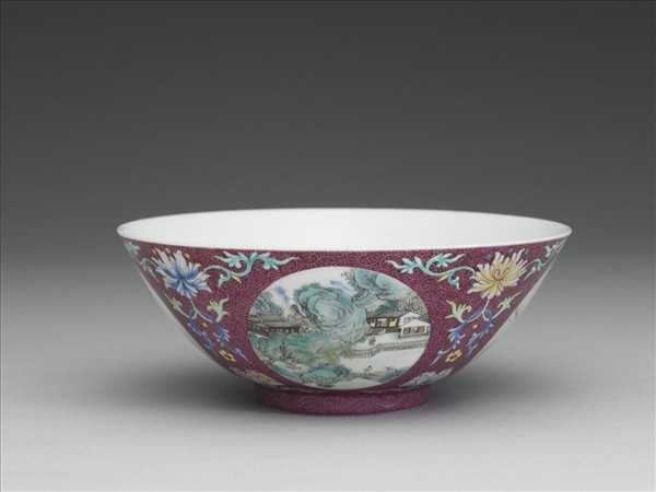 琺瑯彩紅錦地開光四季山水圖碗