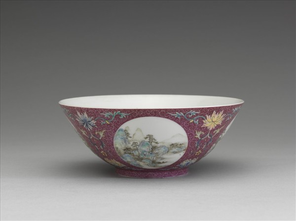 琺瑯彩紅錦地開光四季山水圖碗
