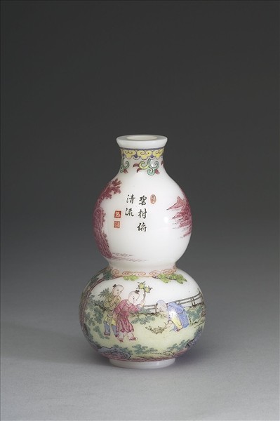 葫蘆形白色玻璃瓶。平口矮圈足,瓶身上半以赭紅琺瑯彩繪山水景致,下半繪三名童子庭園嬉遊。白色玻璃胎上有墨書題詩:「碧樹俯清流」及朱印三方。底有藍料「乾隆年製」楷書款。此瓶構圖上下動靜相映,風景人物樹石用色細膩,無論胎體或色繪,均近似瓷胎畫琺瑯。唯玻璃胎質光潤無瑕,畫面呈色清晰,且具暈染層次,燒製精良。