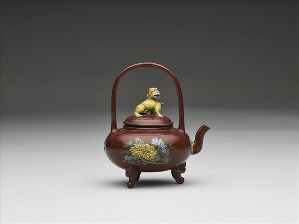 平口,圓碩壺身,平底下接三足,短流,提梁極長,蓋鈕塑黃色奇獸一隻。器用宜興紫砂泥地,胎質不似瓷泥細膩,顆粒較粗,胎中間有黑、黃細砂點,造成表面凹凸不平,故紋飾釉彩處常見細小氣泡劃破所留棕眼遺痕。腹精繪菊花、牡丹與品字形裝飾圖案。壺底書「康熙御製」二行四字黃料楷款,外加框圈一周。有木匣附件一。