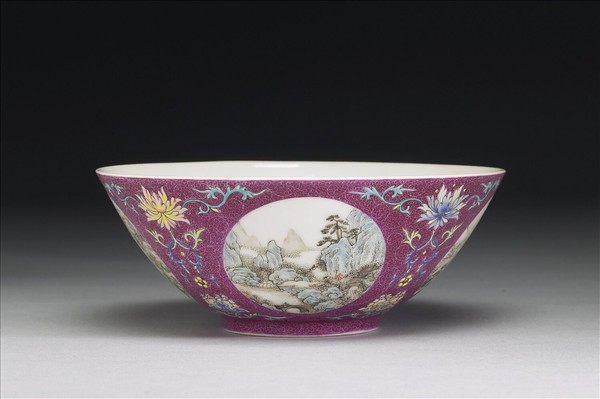 敞口,弧壁,圈足。器內底白地無紋,外壁紫紅地上錐剔鳳尾形卷草錦地紋,餘隙四圓形開光內,分別以墨彩及彩繪畫四季山水人物畫,開光之間鉤繪圖案式洋花。器底青花書「大清乾隆年製」六字三行篆款。