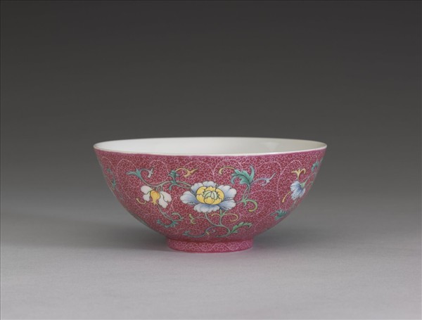 敞口,弧壁,矮圈足。內底白釉上繪桃實、石榴、佛手三折枝果,外壁紫紅地上錐劃卷草紋,其上加飾彩繪折枝花卉四朵。胎骨勻薄透光,底青花書「大清乾隆年製」六字三行篆款。