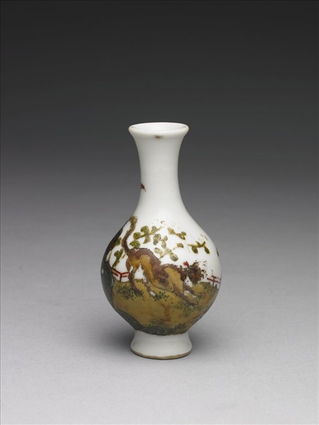 撇口,細長頸,圓腹,圈足高而外撇。瓶身以琺瑯彩繪花葉扶疏的草地上,三犬閒步其間,姿態各異,並飾有欄杆奇石,惟本件多經磨損,犬隻面目不甚完整。圈足露淺灰色胎,無款。有附件木座與木匣各一。