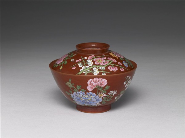 敞口,斜直壁,矮圈足,帶盤形圈足蓋。碗外壁畫四組四季折枝花卉紋,有牡丹、月季;牡丹、雛菊;茶花、梅花;菊花等,碗心飾桃紅月季花一朵。蓋外壁亦繪月季、蓮花、菊花、梅花等四組四季折枝花卉紋,蓋內則內外底均飾月季及蓮花一朵。碗底書「康熙御製」二行四字黃料楷款,外加粗細雙方框。此器為《琺瑯、玻璃、宜興、磁胎陳設檔案》中所列的「宜興胎畫琺瑯五彩四季花卉蓋碗 伍對」,而實際上院藏此類宜興紫砂胎畫琺瑯彩帶蓋茶碗共有十二件,十件「列」字品號者為原藏於端凝殿左右屋內器,二件「子」字號者則藏於清堂子器。此外院藏造形相同,但上下圈足磨掉,另加金色寶珠形蓋鈕者,也就是《琺瑯、玻璃、宜興、磁胎陳設檔》帳上所列「宜興胎畫琺瑯蓋碗,壹件,迸瑯補臘」,併瑯是指琺瑯彩傷缺補臘之意。可見此型蓋碗為宮廷愛用的飲茶用器之一。