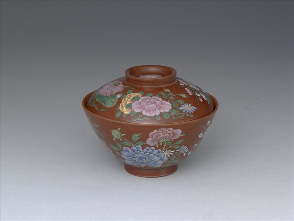 蓋碗,敞口,斜直壁,矮圈足,帶盤形圈足蓋。碗外壁畫四組四季折枝花卉紋,有牡丹、月季;牡丹、雛菊;茶花、梅花;菊花等,碗心飾桃紅月季花一朵。蓋外壁亦繪月季、蓮花、菊花、梅花等四組四季折枝花卉紋,蓋內則內外底各飾月季及蓮花一朵。碗底書「康熙御製」二行四字黃料楷款,外加粗細雙方框。