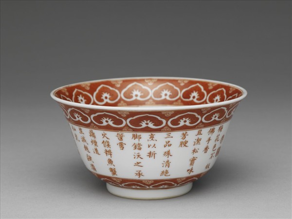 微撇口,深壁,圈足。通體以礬紅描繪花紋,口足內外各為紅底留白如意紋飾,器外壁白地上書乾隆御製詩〈三清茶〉一首,內底繪三清圖有梅花、松樹、佛手三種,外圍與口足有相同的如意文一周。胎體輕薄,質地細膩,紅彩鮮豔。器底礬紅書「大清乾隆年製」六字三行篆書款。 外壁書乾隆十一年(丙寅‧1746)御製〈三清茶〉詩一首:「梅花色不妖,佛手香且潔。松實味芳腴,三品殊清絕。烹以折腳鐺,沃之承筐雪。火候辨魚蟹,鼎煙迭生滅。越甌潑仙乳,氈廬適禪悅。五蘊淨大半,可悟不可說。馥馥兜羅遞,活活雲漿澈。偓佺遺可餐,林逋賞時別。懶舉趙州案,頗笑玉川譎。寒宵聽行漏,古月看懸玦。軟飽趁幾餘,敲吟興無竭。」詩文後加識:「乾隆丙寅小春御題」,並有圓方篆印「乾」「隆」二字。根據廖寶秀《也可以清心:茶器.茶事.茶畫》一書所研究,此詩為乾隆皇帝於乾隆十一年秋巡五臺山,回程至定興遇雪,於氈帳中以雪水烹煮三清茶時所作。 三清茶為乾隆皇帝一生中極為喜愛的茶,常於各種場合品啜,如祈穀齋居、重華宮茶宴廷臣或山齋閒居皆見烹煮三清茶。以雪水沃梅花、松實、佛手,再泡以龍井茶,謂之三清茶。乾隆十一年御製詩〈三清茶〉詩題後加註:「以雪水沃梅花、松實、佛手,啜之名曰三清。」而此杯內底以礬紅畫梅、松、佛手三株,正是三清之象徵,由繪圖而知,此三清茶碗乃乾隆皇帝用來飲啜三清茶的茶碗。