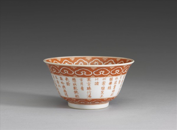 微撇口,深壁,圈足。通體以礬紅描繪花紋,口足內外各為紅底留白如意紋飾,器外壁白地上書乾隆御製詩〈三清茶〉一首,內底繪三清圖有梅花、松樹、佛手三種,外圍與口足有相同的如意文一周。胎體輕薄,質地細膩,紅彩鮮豔。器底礬紅書「大清乾隆年製」六字三行篆書款。 外壁書乾隆十一年(丙寅‧1746)御製〈三清茶〉詩一首:「梅花色不妖,佛手香且潔。松實味芳腴,三品殊清絕。烹以折腳鐺,沃之承筐雪。火候辨魚蟹,鼎煙迭生滅。越甌潑仙乳,氈廬適禪悅。五蘊淨大半,可悟不可說。馥馥兜羅遞,活活雲漿澈。偓佺遺可餐,林逋賞時別。懶舉趙州案,頗笑玉川譎。寒宵聽行漏,古月看懸玦。軟飽趁幾餘,敲吟興無竭。」詩文後加識:「乾隆丙寅小春御題」,並有圓方篆印「乾」「隆」二字。根據廖寶秀《也可以清心:茶器.茶事.茶畫》一書所研究,此詩為乾隆皇帝於乾隆十一年秋巡五臺山,回程至定興遇雪,於氈帳中以雪水烹煮三清茶時所作。 三清茶為乾隆皇帝一生中極為喜愛的茶,常於各種場合品啜,如祈穀齋居、重華宮茶宴廷臣或山齋閒居皆見烹煮三清茶。以雪水沃梅花、松實、佛手,再泡以龍井茶,謂之三清茶。乾隆十一年御製詩〈三清茶〉詩題後加註:「以雪水沃梅花、松實、佛手,啜之名曰三清。」而此杯內底以礬紅畫梅、松、佛手三株,正是三清之象徵,由繪圖而知,此三清茶碗乃乾隆皇帝用來飲啜三清茶的茶碗。