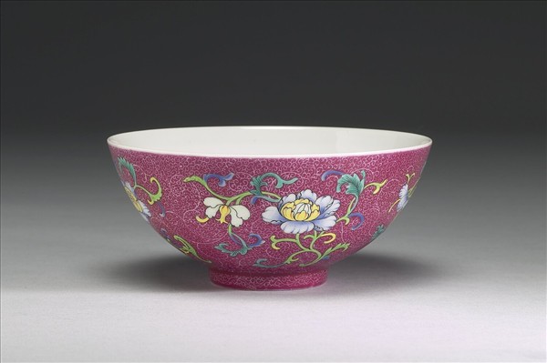 琺瑯彩洋紅地花卉紋三多碗