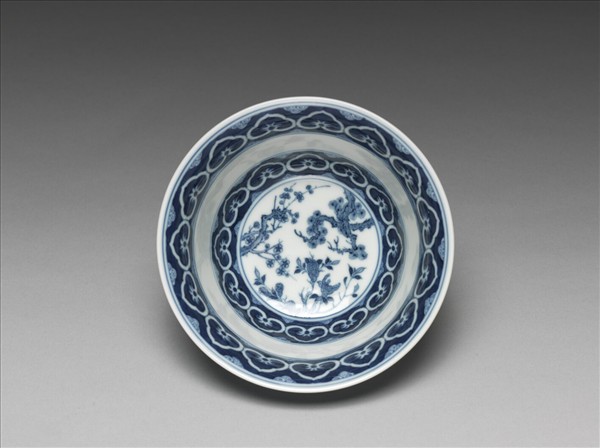 碗撇口,通體以青花描繪花紋,口足內外各為青底留白如意紋飾,杯外白地上書乾隆御製詩〈三清茶〉一首,內底繪三清圖有梅花、松樹、佛手三種,外圍與口足飾有相同的如意紋一周。胎體輕薄,質地細膩,杯底書「大清乾隆年製」二行六字篆款。此為乾隆皇帝專門飲啜三清茶的茶碗,院藏瓷器品類有青花及礬紅兩種,其製作檔案可見於乾隆十一年(1746)七月《活計檔》發往江西景德鎮御窯場的記載:「二十八日,太監胡世傑交嘉窯青花白地人物撇口鍾,隨舊錦匣,傳旨照此鍾樣將裡面底上改畫帶枝松、梅、佛手花紋,線上照裡口一樣添如意雲,中間要白地,鍾外口並足上亦添如意雲,中間亦要白地寫御筆字,先做樣呈覽,准時交江西燒造。欽此。於十一月初七日首領薩木哈將做得木胎畫藍色如意雲,口足中身寫字鍾樣一件持進交太監胡世傑呈覽。奉旨;照准燒造,將鍾上字着唐英分勻挪直。…其藍花鍾上花樣字圖俱要一色藍;紅花鍾上花樣字圖俱要一色紅,鍾底俱燒大清乾隆年製篆字方款,其款亦要隨鍾的顏色。欽此。」清宮器物製作嚴謹,活計須先呈皇帝看過紙樣,再觀木樣,由此則活計檔案記載,一目瞭然。 茶鍾外壁書乾隆十一年〈三清茶〉詩一首:「梅花色不妖,佛手香且潔。松實味芳腴,三品殊清絕。烹以折腳鐺,沃之承筐雪。火候辨魚蟹,鼎煙迭生滅。越甌潑仙乳,氈廬適禪悅。五蘊淨大半,可悟不可說。馥馥兜羅遞,活活雲漿澈。偓佺遺可餐,林逋賞時別。懶舉趙州案,頗笑玉川譎。寒宵聽行漏,古月看懸玦。軟飽趁幾餘,敲吟興無竭。」詩文後加識:「乾隆丙寅小春御題」,並有圓方篆印「乾」「隆」二字。此詩為乾隆皇帝於乾隆十一年秋巡五臺山,回程至定興遇雪,於氈帳中以雪水烹煮三清茶時所作。乾隆皇帝於茶舍使用的茶器,除竹茶爐外最常提及的即白地青花或紅花三清詩等詩意茶鍾。據《活計檔》記載乾隆茶舍「春風啜茗臺」、「碧琳館」、「竹爐山房」、熱河避暑山莊「千尺雪」、盤山靜寄山莊「千尺雪」、西苑瀛台「千尺雪」等茶舍均陳設有口足如意紋飾的御製詩文茶碗。 乾隆皇帝因酷愛三清茶,不僅屬文賦詩贊美三清茶,還作有其他茶詩文茶鍾,如「烹雨前茶有作」,而「荷露烹茶」御製詩茶壺及茶碗即乾隆皇帝使用於避暑山莊「千尺雪」及「味甘書屋」茶舍的茶器,這類型茶鍾正是乾隆一生最鍾愛的樣式,甚至影響及之後的幾朝皇帝亦相沿襲。