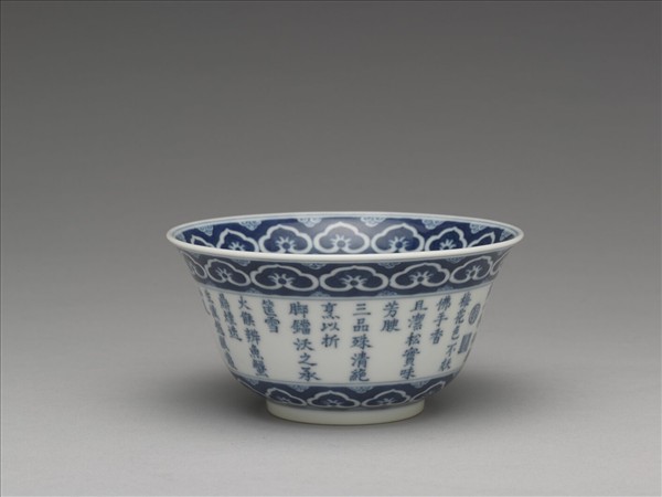 撇口,深壁,圈足。通體以青花描繪花紋,口足內外各為藍底留白如意紋飾,杯外白地上書乾隆御製詩〈三清茶〉一首,內底繪三清圖有梅花、松樹、佛手三種,外圍與口足有相同的如意文一周。青花釉色翠麗,杯底青花書「大清乾隆年製」六字三行篆款。如前所述(參照故瓷017581說明),此為乾隆皇帝專用飲啜三清茶的茶碗,院藏乾隆瓷器品類有青花及礬紅兩種,此二器即為《琺瑯、玻璃、宜興、磁胎陳設檔案》中乾隆款磁胎內所載「青花白地詩意茶鐘 拾件」、「紅花白地詩意茶鐘 拾件」。 乾隆皇帝因酷愛三清茶,不僅屬文賦詩贊美三清茶,還作三清茶壺、三清茶碗,甚至於茶宴結束後,還把三清茶碗賞給與會的朝臣。乾隆於五十一年御製詩〈重華宮茶宴廷臣及內廷翰林用五福五代堂聯句復得詩二首〉中說:「…浮香真不負三清。(下自註:重華宮茶宴以梅花、松子、佛手用雪水烹之,即以御製三清詩茶碗並賜。)」,故知此類茶碗,乾隆皇帝稱為「三清詩茶碗」。除瓷器外,另有漆製紅漆描黑,以及剔紅三清茶杯,外壁均書刻乾隆御製詩「三清茶」一首。