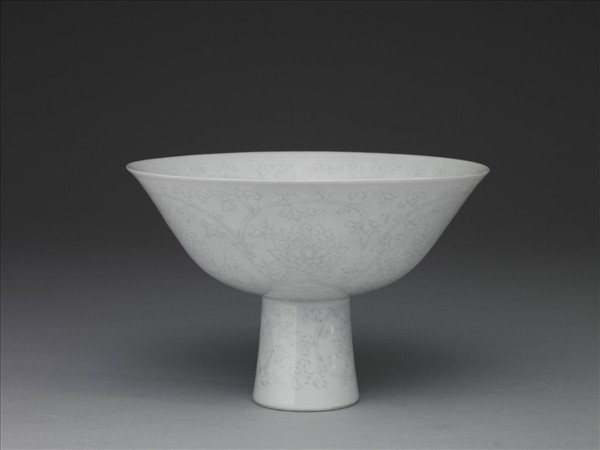 侈口,深壁,高圈足。胎質極薄,釉色甜白,內外壁及足均錐拱纏枝番蓮花,外壁底邊加飾蓮瓣紋一週。花紋均隱青色。碗心有錐拱「大清乾隆年製」六楷字款。