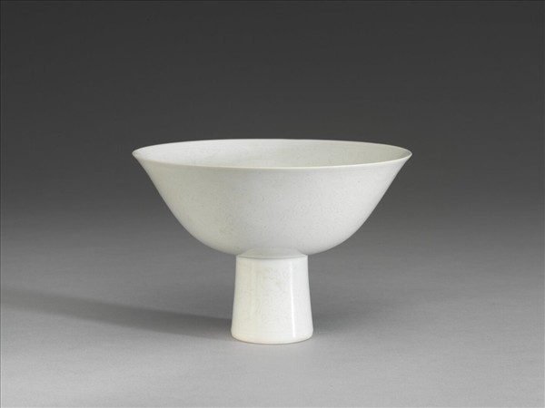 侈口,深壁,高圈足。胎質極薄,釉色甜白,內外壁及足均錐拱纏枝番蓮花,外壁底邊加飾蓮瓣紋一週。花紋均隱青色。碗心有錐拱「大清乾隆年製」六楷字款。