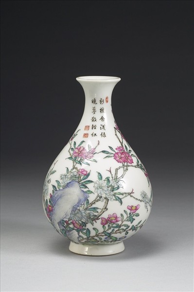 撇口,短頸,碩腹,矮圈足,這類瓶制通稱玉壺春。瓶白地上琺瑯彩繪紅、白桃花與山茶,並綴以湖石、野菊;頸肩處墨書詩句:「新枝含淺綠,曉萼散輕紅。」詩句上下紅料描繪「佳麗」、「翠鋪」、「霞映」三印。胎體勻厚,質白細膩,器底藍料書「乾隆年製」四字二行宋體楷款,外加雙框。