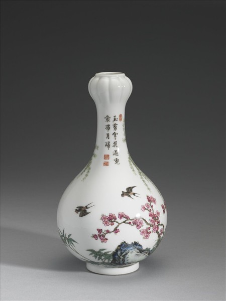 瓶作蒜頭口,束頸,斜肩,垂腹,圈足,因瓶口鼓圓成凸瓣狀,故稱之為「蒜頭瓶」。全器施白釉為底,上繪石塊、綠竹、桃樹與柳樹,間有雙燕飛翔、成對綬帶鳥停棲於柳樹上,雙燕皆張口、飛行姿態各異,與休憩的綬帶鳥恰成動靜對比,增添景色生意。所畫動植物除柳葉以沒骨方式表現外,其餘形態皆勾勒輪廓線,再填以色彩,其中,石塊與枝幹另再加上數道線條於輪廓邊緣處,以強調質感與立體感,畫工相當細緻。頸部空白處墨書「玉剪穿花過,霓裳帶月歸」二句,剪取自明代詩人申時行(1535-1614)之詩作,詩首、詩尾有紅料描書篆體朱文「佳麗」、「翠鋪」、「霞映」三印。近圈足之底緣有一圈刮釉痕跡。圈足露胎,底有「乾隆年製」雙方框宋體款。