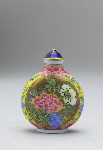 器作扁圓壺形,圓口,束頸,扁圓腹,橢圓圈足,白色半透明玻璃胎,口緣與足底緣皆露白色胎體並畫上藍線一周,頸飾花瓣紋,以紅色線條勾勒輪廓,近輪廓處留白,餘則填上紅料;腹中央兩面圓形開光,內金地一面彩繪牡丹花叢,其枝葉、花瓣皆有線條勾邊,花形姿態各異,葉子末端偶有翻轉,一面彩繪海棠與菊花花叢;側黃地彩繪花葉,並延伸繞飾器底一周,底篆刻雙行「乾隆年製」。帶銅胎藍琺瑯彩蓋及牙匙。