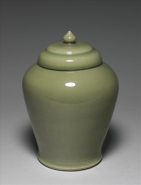 青瓷蓋罐的頸部短而直,肩部豐滿,腹部身下方收斂,底部略為外撇,帶低矮圈足,足內中央處內凹。器內外及蓋皆施釉,釉層豐厚凝潤,釉色翠綠,口緣、圈足著地處及器蓋內一圈修整整齊的澀圈無釉,露出橘紅色胎體。北京海淀五塔寺曾出土有類似器形的白釉纏枝蓮紋蓋罐,或可推測兩者同為供應官方使用而製的作品。