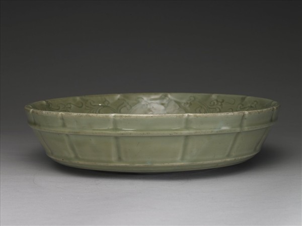 十四瓣花口大洗,敞口、淺壁,壁下緣圓收為平底,底部中央寬環形無釉墊燒區,呈朱褐色,墊燒處色深褐。外壁於上腹部作凸弦紋一道,如箍桶式環束此瓣稜;下腹底緣作三道凸弦紋。器內壁劃花轉枝花卉,主花四朵,葉蔓延伸長。內底為水波雙魚紋。雙魚貼印突起為龍泉窯自宋代以來常見的裝飾圖案,本器僅作平面式押印與劃刻。