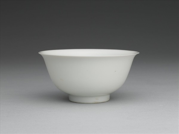茶鍾撇口,弧壁,矮圈足,通體施甜白釉,內壁印飾雙雲龍紋,碗壁勻薄,圈足露胎,潔白細膩。器心針刻「永樂年製」四字二行篆款,外加單圈,然刻紋淺細,不易辨識。永樂撇口茶鍾造型端麗,釉色腴潤,亦為清代雍正、乾隆時期瓷胎畫琺瑯茶鍾的原型。 明代景德鎮官窯自永樂時期開始,白瓷的製作有了重大突破,高嶺土中三氧化二鋁的含量增加,透明釉內減少助熔劑石灰石的成分,避開了白釉泛青情況的產生,因此使產品潔白腴潤,與白砂糖的顏色相近,故而有「甜白」美稱。《點查報告》上,或依清宮舊名定為「永樂款白瓷脫胎暗龍茶鍾」。明人言「品茶用甌,白瓷為良」,明代品茶圖上所用茶鍾亦以白瓷為多,仇英〈東林圖〉(故畫000925)、唐寅〈煎茶圖〉(中畫000073)卷等皆描繪撇口、敞口茶鍾,而與清代不同者,明代茶碗、茶鍾多帶朱漆托而不帶蓋。這類撇口白瓷茶鍾為明代最常見的造型之一,也是清代琺瑯彩瓷茶鍾的原型,直至今日工夫茶飲小茶杯造型亦多沿用,惟尺寸縮小而已,可謂茶杯的經典造型。