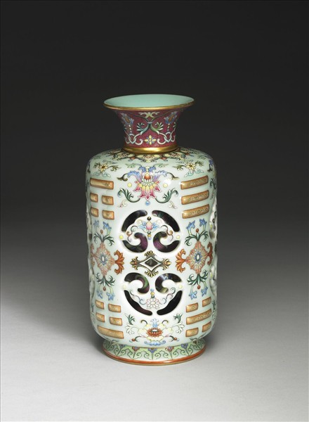 鏤空轉旋瓶分四段個別燒製後榫接組裝而成:圈足、器身、內膽、及頸部各一段。瓶撇口,短頸,平肩、圓筒身,撇足。外層腹部雕錐鏤四組如意雲紋,間飾八卦文及彩繪變形番蓮紋、銀蓮花等洋花花卉及圖案紋,八卦文均突起,其上金彩描繪卷草圖案花並加描金邊;頸部及內膽為洋紅剔錐錦上添花紋飾,足邊冬青地上畫如意雲及圖案花一周。胎體厚重,器底冬青地上青花書「大清乾隆年製」六字三行篆款。