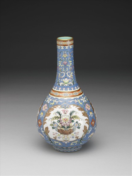 膽瓶小口,長頸,腹垂如膽,故名。通體以翠藍為地,上錐刻卷草紋,餘隙彩繪洋花。口沿、肩處深淺橘紅地上繪飾連環朵花紋,底邊則畫粉色蓮瓣一圈。器腹三開光各以如意串連,開光則以菊葉紋繞圈為飾,其上各繪如意連圈紋,開光內各繪西洋藍花,內飾三色洋菊花卉。器內頸及底部均施湖綠色釉,底部藍料書「乾隆年製」四字篆款,外加雙框。