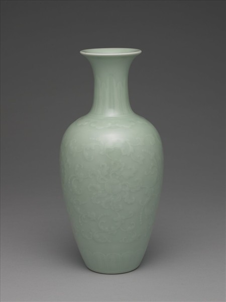 撇口,直頸,頸部上下微撇,圓肩,長腹,腹修長而下漸斂,底部內凹為淺圈足。器內壁光素無紋,外壁拱花為飾,頸部一圈蕉葉紋,腹部上方頸肩處裝飾如意雲頭紋一圈,與前述蕉葉紋以兩道弦紋為界;肩與腹以纏枝番蓮紋為主紋,脛飾變形蓮瓣紋一周,下接弦紋一道。全器內外壁通施仿湘湖粉青釉,釉色瑩潤飽滿。圈足足端足端無釉露胎,呈米白色,足地施仿湘湖粉青釉,器底中央有「大清乾隆年製」六字三行青花篆書款。
