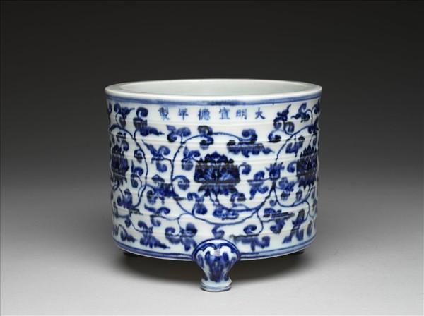 直筒器身,寬口沿,平底,附三足。外壁畫六朵纏枝蓮花紋,三足卷草紋,口、足各飾青線二道。青花濃艷暈散,深處皆帶褐綠、鐵褐結晶疵斑,內壁白釉泛青,口沿積釉。胎骨勻厚,三足底及底部露胎無釉,惟三足圈內的爐底環狀一圈施白釉,泛青呈湖綠色。胎質細膩堅緻,胎釉間呈火石紅色。外口沿雙青線下青花橫書「大明宣德年製」一行六字楷款。