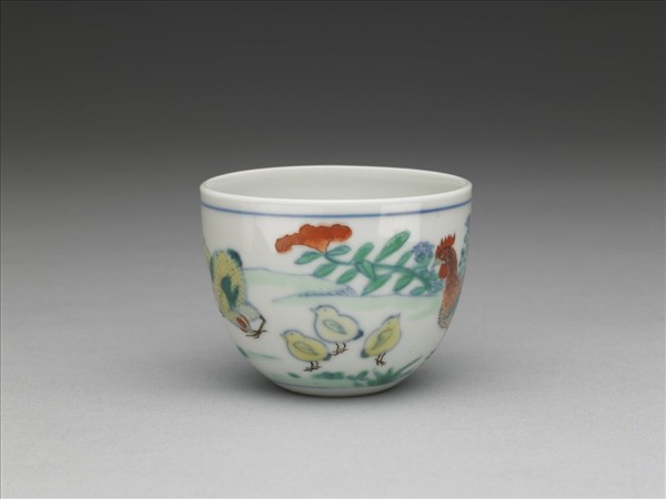 圓口小盃,直口深壁,小平底內凹成足,全器以釉下青花與釉上彩的鬥彩技法繪飾紋樣。器外壁繪緩坡花草,並有大小雞群遊走其間,其中母雞俯身回首,正貼地啄食,周繞小雞數隻,而一旁公雞直立前視,作守護狀。底有釉下鈷藍書「大明成化年製」雙方框雙行六字楷款。全器仿明代成化雞缸杯紋飾,而製為酒圓小杯,寫意筆觸,非成化器真貌,為後仿作品。