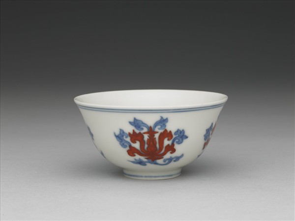 侈口窄唇,深壁,淺圈足。器以釉下青花與釉上紅彩為飾。杯外壁四朵折枝番蓮花,以青料?繪輪廓,花瓣加飾紅彩。杯內素白無紋。口足共飾青線三道。底青花書「大明成化年製」雙方框六字楷款。