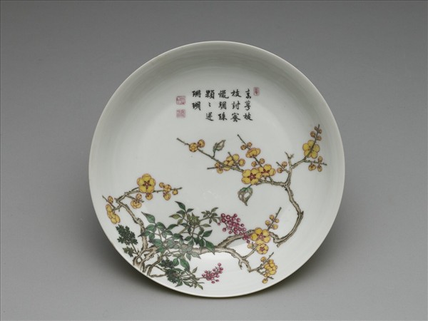 這件盤侈口、緩弧壁、矮圈足。器外壁滿施黃釉,在盤心處自左下對開彩繪翠柏、天竹及臘梅。盤面上方空白處以墨書寫有「素萼枝枝封蜜蠟,明珠顆顆迸珊瑚」詩句。詩句前有「三秀」,後有「四時」(白文)、「長春」共三枚紅料印。器底帶「大清雍正年製」二行青花楷書雙圈款。