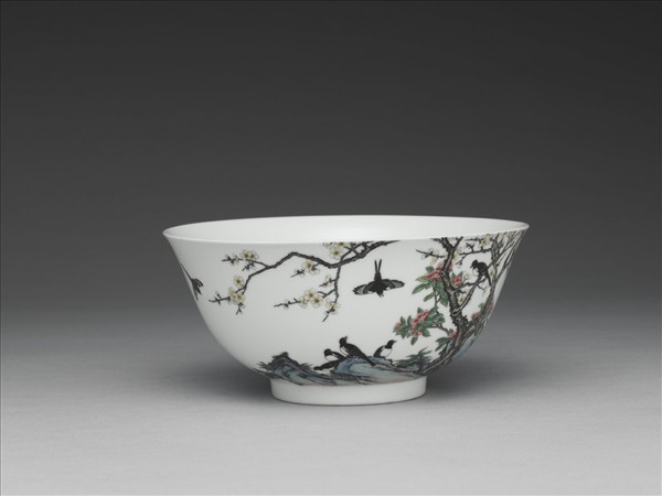 碗侈口,深弧壁,平底,淺圈足,胎體潔白細膩。與故瓷17690為一對,構圖相似,外壁白地上一面畫坡石、流水、翠竹、白梅、茶梅,並加飾十二隻飛棲或休憩其間的喜鵲,姿態各異,多有互動,畫工細緻,所畫枝幹花葉、竹石坡岸等皆以黑色勾勒輪廓,再填色彩。一面墨書題句「幾度送風臨玉戶,逐時傳喜上瑤墀」,詩句改自唐韓溉《鵲》,詩首、詩尾有紅料描書篆體朱文「鳳采」、白文「壽古」、朱文「香清」三印。碗內白釉素面無紋,圈足露胎,底有「雍正年製」兩行宋體款,外加雙方框。