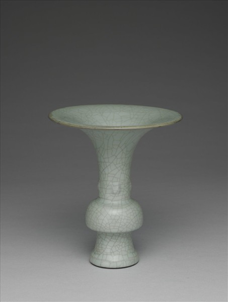 喇叭口,直長頸,覆碗形腹,長脛外撇,底端微鼓,凹足,頸部下緣有長形凸起狀乳丁。全器施青釉,呈灰青色,釉面佈滿開片紋,口緣處因流釉呈淡褐色,圈足底緣塗鐵黑色護胎汁。