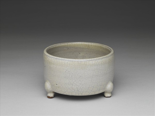 短筒型香爐,斂圓口,深直壁微外鼓,平底,下接三個蹄形短足,外底中央凹陷形成一圓形淺槽。全器採支、墊併用裝燒,內外施青釉,燒後呈色米黃泛灰,釉面出現深淺兩種灰色紋片。足端無釉塗醬汁,局部顯露出灰色胎。內底週邊粘附三個渣餅,外底圓槽周緣有六枚支釘。內底沾黏渣餅的現象,亦見於元青瓷海棠式盆(故瓷017188)。