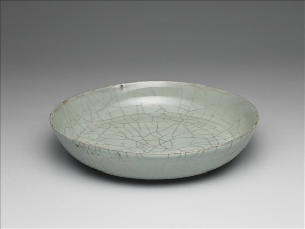 圓侈口,弧形淺壁,平底,淺圈足。週壁胎較薄,底稍厚。採支、墊結合裝燒法燒製,內外施青釉,呈色粉青微泛灰,外底部偏灰綠,釉面帶灰色大紋片,局部可見透明冰裂紋。外底面存留五個鮮見的小圓點支釘(如故瓷014116),圈足修飾勻整,足端舊磕傷處露出深灰色胎。器形和河南省寶豐縣清涼寺窯址出土的平底盤近似,小圓點支釘則見於日人米內山庸夫在傳稱郊壇下窯址採集到的瓷片。