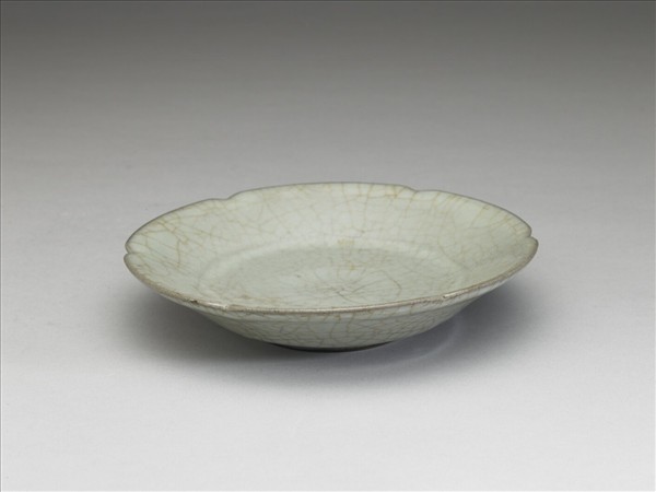 六瓣葵花形,侈口,淺壁,近足際向內轉折成折腰盤式。平底,矮圈足。通體施青瓷釉,釉色灰青,略帶米黃色調,釉表開深色細紋片。口沿釉薄處,現出灰色邊;內裡隱見一些冰裂開片。施釉至足際,足緣無釉,露出燒後胎色。底面鐫刻乾隆皇帝〈詠官窯碟子〉:「鐵足冰紋火氣蠲,口分六出體規圓。較於缾斝猶多見,華者脆知樸者堅」御製詩。詩末署「乾隆丙申夏御題」紀年銘(乾隆四十一年,1776),並落「古香」和「太璞」兩枚鈐印。